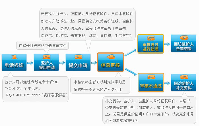 如果您已经申请家长监护服务,您可以通过输入服务号码进行进度查询,了解您所提交的服务申请最新处理进展,如:传真是否收到,是否需要后续提交信息,账号是否已经进行处理等。服务期间,如果您对需要提交的信息或者处理结果有疑问,或者其他任何问题,您均可以随时联系我们,我们将由专门负责的客服主管为您提供咨询解答服务,或者配合、指导您解决问题。进入》》